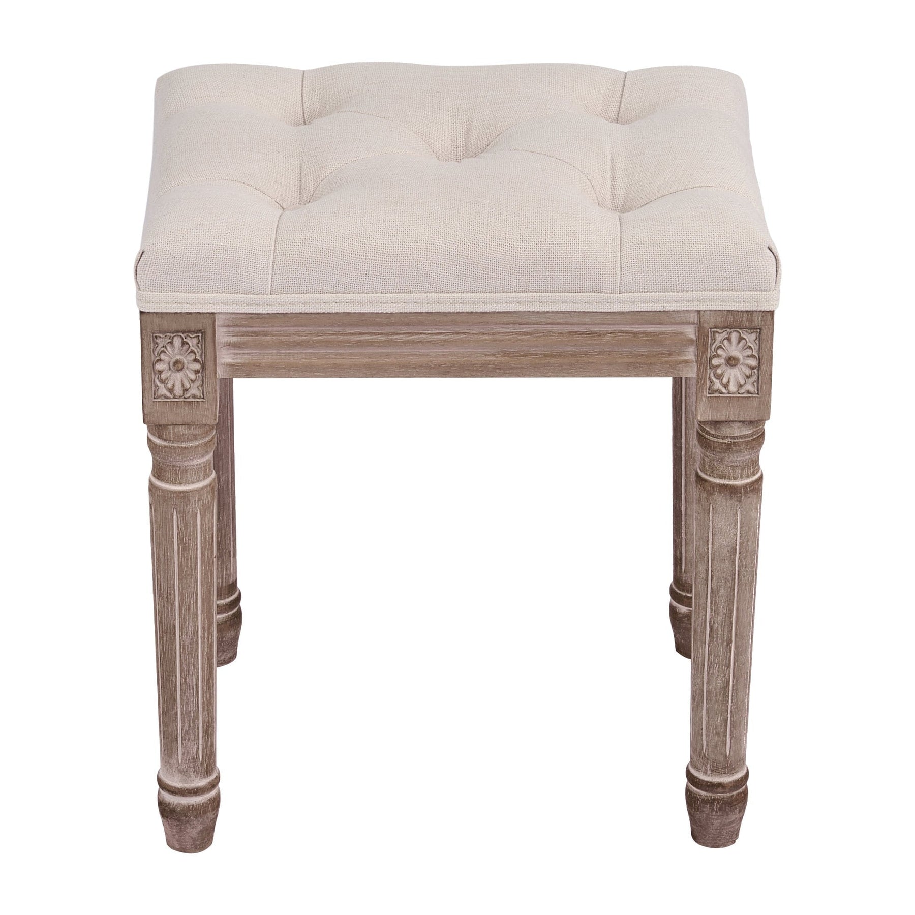 Want to enjoy classic Old World charm without sacrificing American strength or functionality? This plushly upholstered footstool is here for you! Styled after vintage French furniture, this stylish step or vanity stool has traditional carved ornamentation but offers modern comfort with its thick foam padding. The rubberwood frame and legs are weathered to an attractively lived-in look but will give you 330 pounds of capacity and years of dependable service. Functional pomo art with classic taste, this small bench seat works in any space and decor from traditional farmhouse to contemporary minimalist. Whether cozied up to a piano or used as an entryway bench, this excellent modern seating is sure to brighten your room and your life.