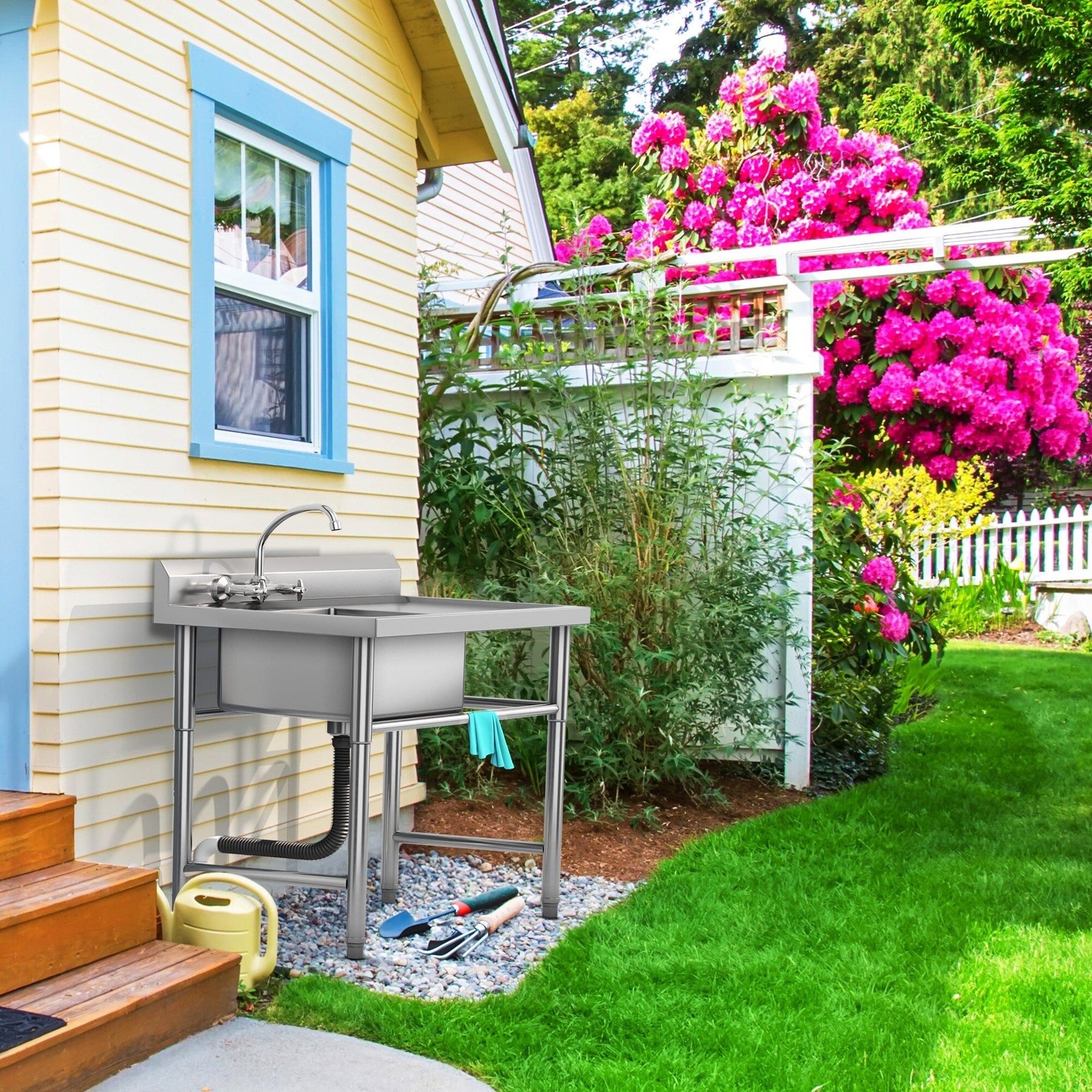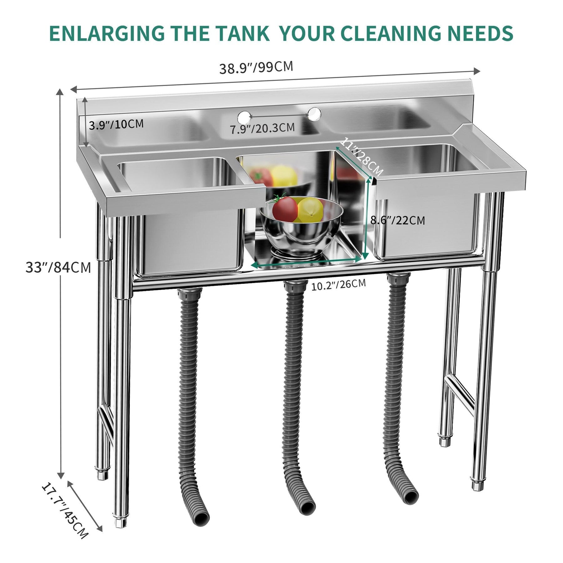The freestanding utility sink is highly resistant to corrosion, oxidation, and deformation so it achieves long-lasting durability without rust or warping, no worry about leaks; Additionally, its smooth surface makes it effortless to clean, saving you valuable time and effort in your life. The overall size is 39'x18'x37' , Bowl size - 10.24' x 11.02' , 8.7' depth, making it ideal for cleaning dishes and even clothes, help maintain a bright, prevent clogging of the drain and clean operating environment;
