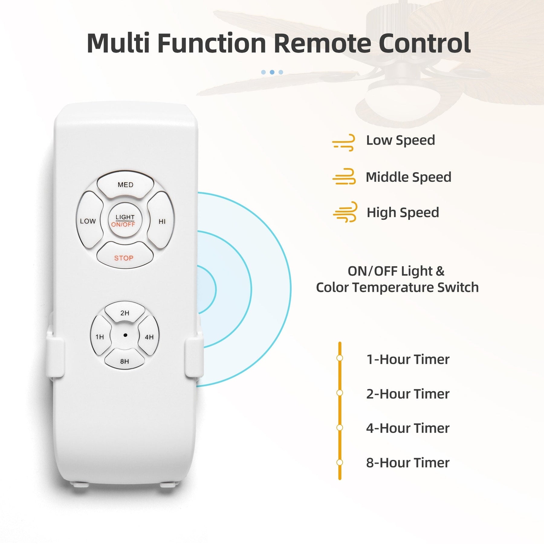 This charming tropical ceiling fan with light features a tropical island design, crafted with five palm leaf blades, adding form and functionality to your home space. It is sturdy, lightweight, and aerodynamic, ensuring a brand new appearance for many years to come. The fan features an embedded design and is perfect for medium-sized rooms under 350 square feet.