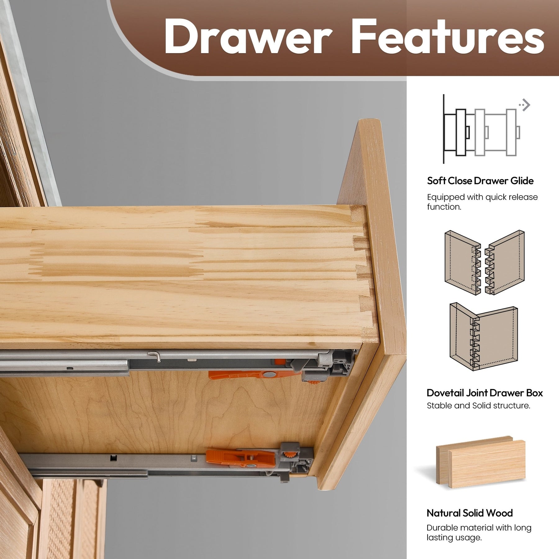 36 inch - One soft-closing door with a rattan bamboo panel and three sturdy, soft-closing dovetail drawers.