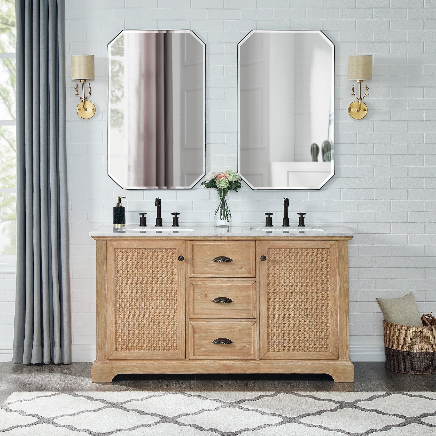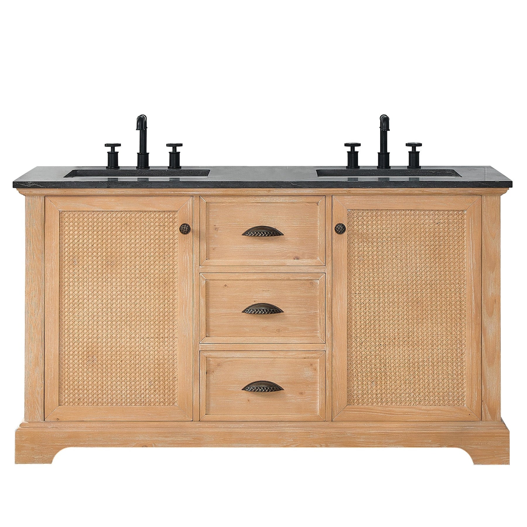 60 inch - Two soft-closing doors with a rattan bamboo panel and three sturdy, soft-closing dovetail drawers.
