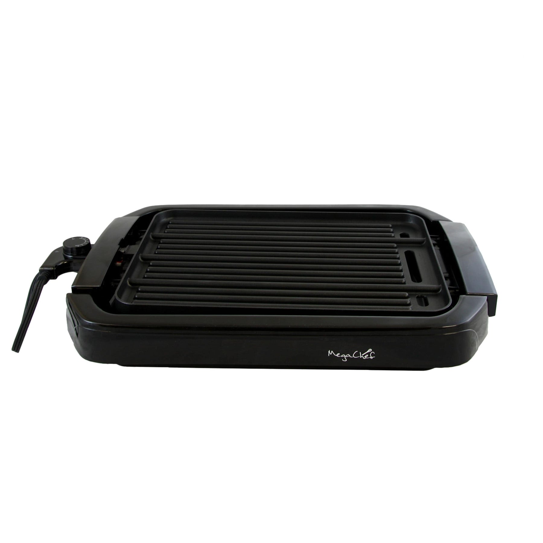 The MegaChef Reversible Indoor Grill and Griddle is designed with a non-stick coating so that you can easily prepare delicious and appetizing meals with less oil than traditional cooking methods. MegaChef understands that no matter the weather outside, friends and family should always be welcome to enjoy juicy grilled meats and vegetables. Rain or Shine, this grill will be your ticket to those perfect grill lines everyone loves to see! The versatility of a reversible cooking surface means you can grill your meats and veggies, flip the grills cooking surface over and use it as a griddle for eggs, pancakes and much, much more!The non stick surface also means that your clean up is a breeze! Simply and easily wipe down any remaining foods with a moist dish cloth and you're done!This grill is designed to be light weight and easily portable. You can easily take this reversible grill to your next vacation or getaway! The removable, adjustable temperature control accurately sets cooking temperature to achieve desired results when cooking a variety of foods. This grill offers a 15' by 11' cooking surface on both sides of the cooking surface panel. Which means you are getting both a 15' Griddle and a 15' Grill all in one!* Item Dimensions: 19.50' L x 16' W x 4' H