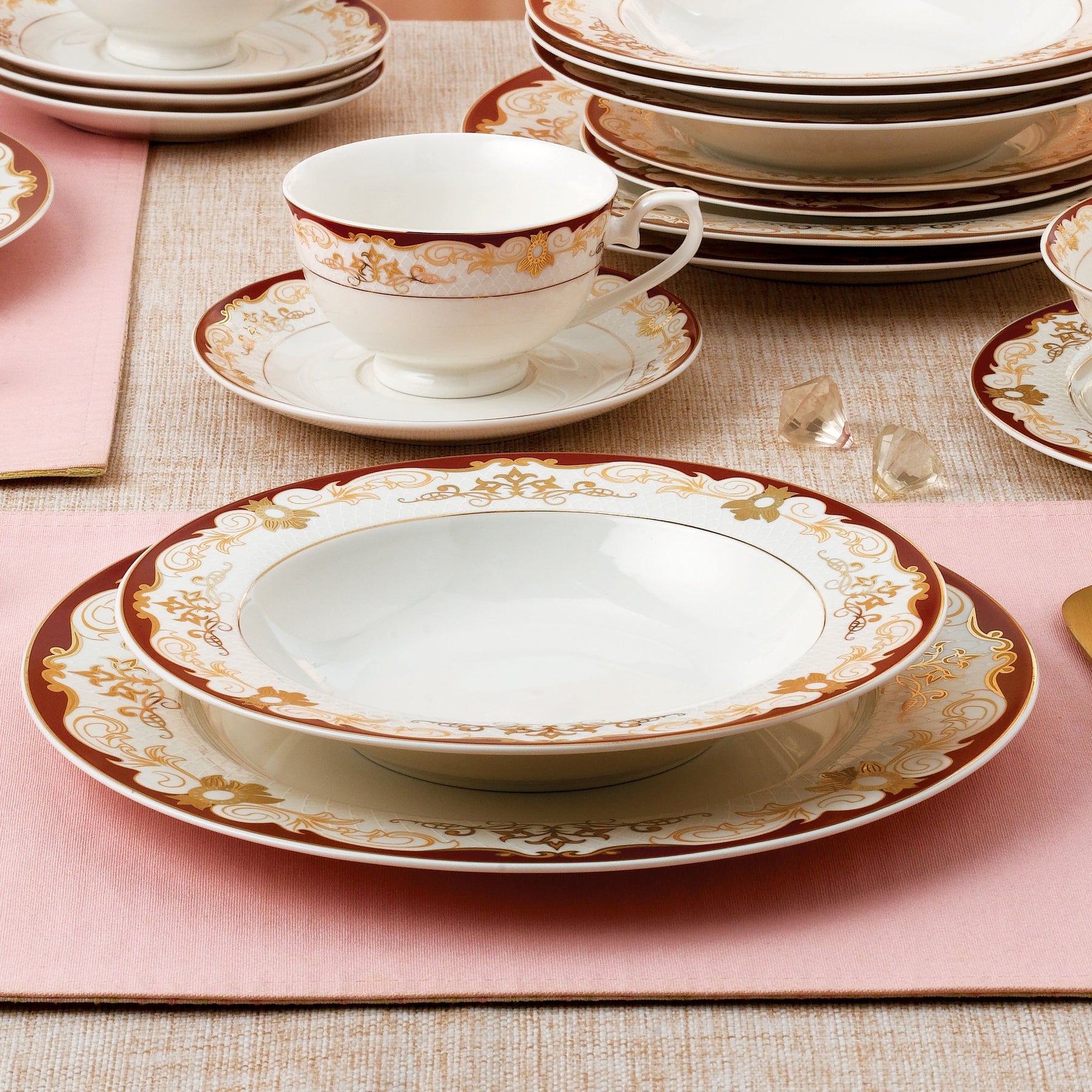 This elegant bone china set has durable quality with a delicate and exquisute look. The Mabel pattern from the La Luna Collection by Lorren Home Trends is a fun a artistic pattern featuring an elegant gold scroll design surrounded by a burgundy border on light weight translucent bone china. Service to easily entertain 4 people. Set Includes: 4-10.5' Dinner Plates, 4-8.5' Soup Bowl(holds 8 ounces), 4-7.5' Salad/bread and butter dishes, 4-8 Ounce Cups 5'x4'x2.25', 4-Saucers, 4-5.5' Fruit or Dessert bowls. Dishwasher Safe. Oven safe to 350 degrees.