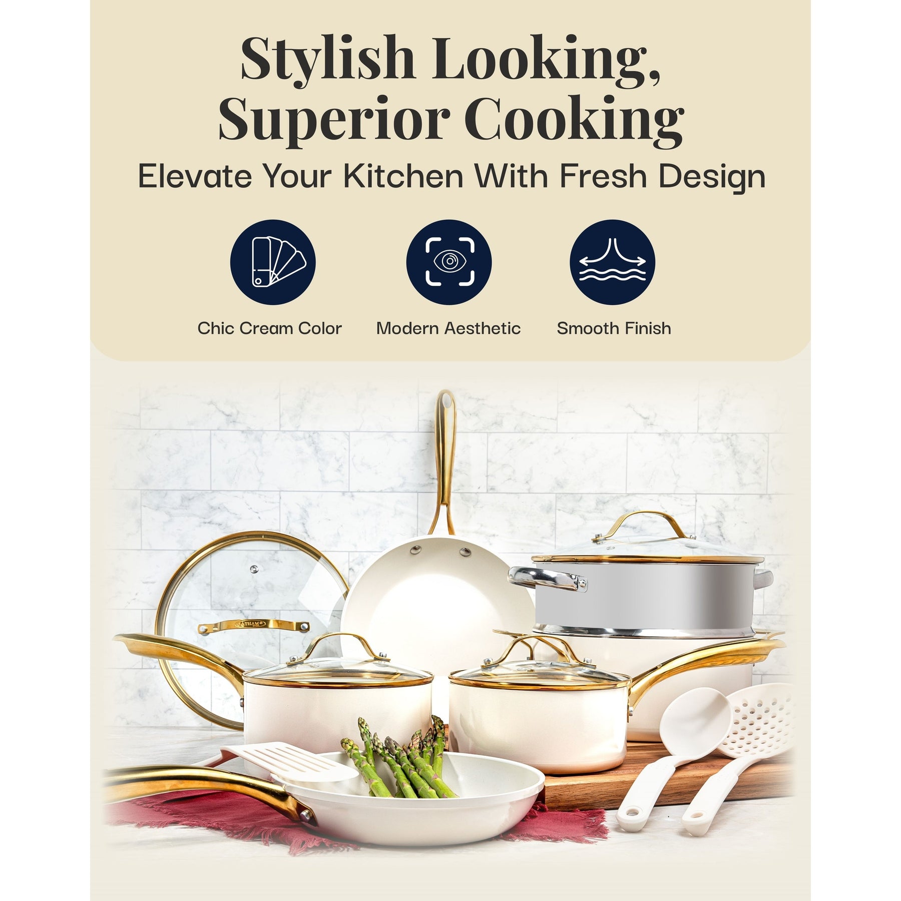 • Elegant Cream Finish with Gold-Tone Accents: The modern cream-colored exterior and luxurious stainless steel gold-tone handles add a sophisticated touch to any kitchen, blending style with practicality.