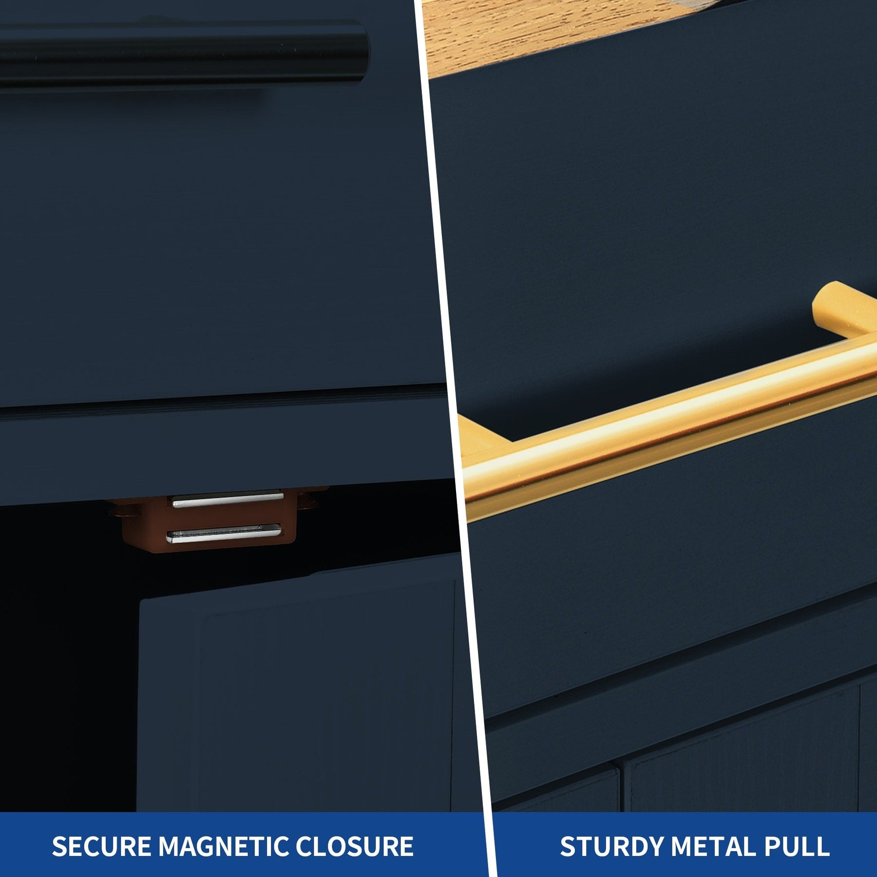 - Includes 2 drawers and 3 shelves for organized kitchen storage.