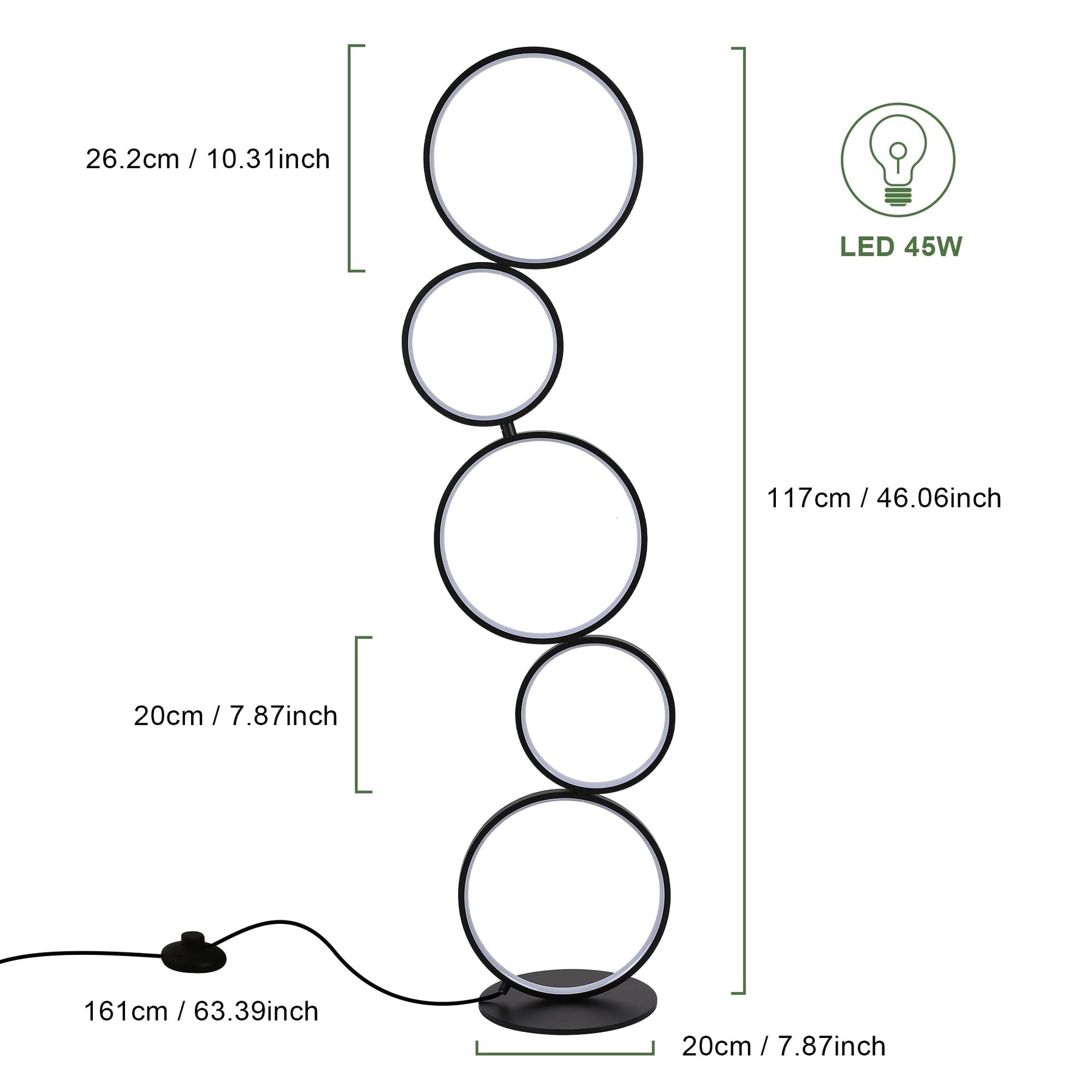 The unique and elegant style of this modern floor lamp left a deep impression on the guests. The 5 ring lamps combined clamp is about 46 inches tall, suitable for living room, bedroom, study room, kids room, etc. Enrich warm and comfortable atmosphere to your living room.