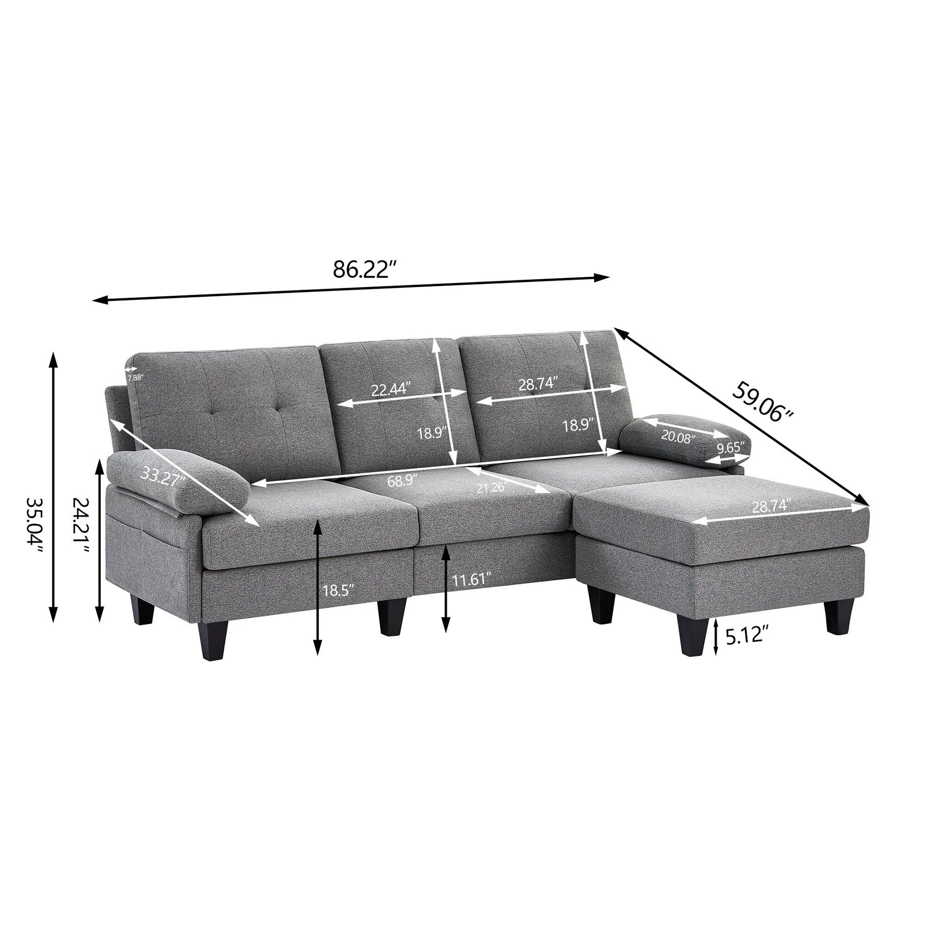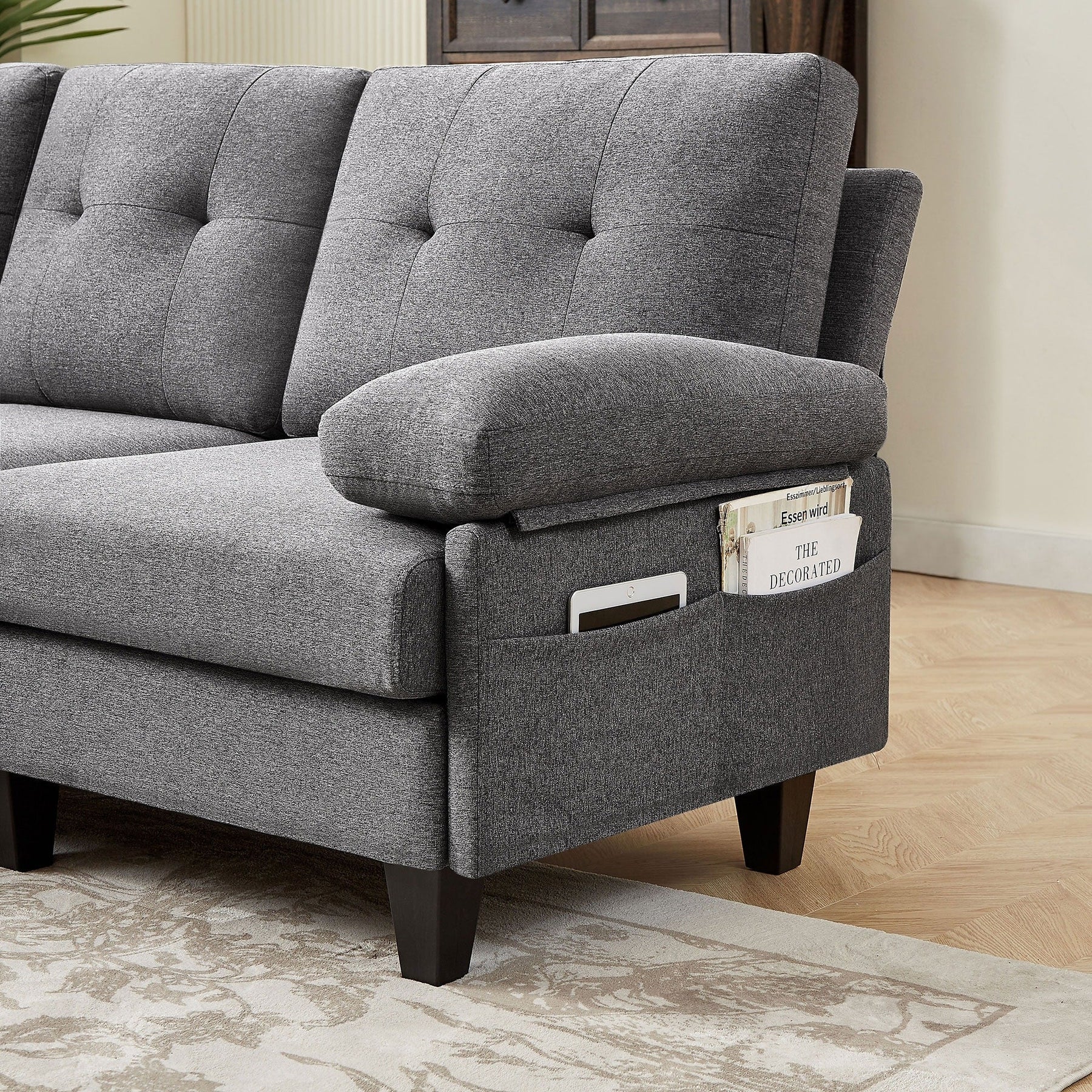 Create a comfortable and modern living space with our Modern Sectional Sofa Couch L Shaped with Ottoman, and Side Storage Bags. This upholstered contemporary sofa design is made with soft fabrics and can be arranged in various ways to fit small or large living areas. The ergonomic back cushion is designed to fit your back closely and support it firmly while the high density foam cushions provide ultimate comfort and support. With two storage bags on the sides, you can easily store small appliances. The entire couch frame is made of high-quality hardwood making it sturdy and durable, and the ottoman is movable for easy reorganization. Assembly is easy and hassle-free with no extra tools required.