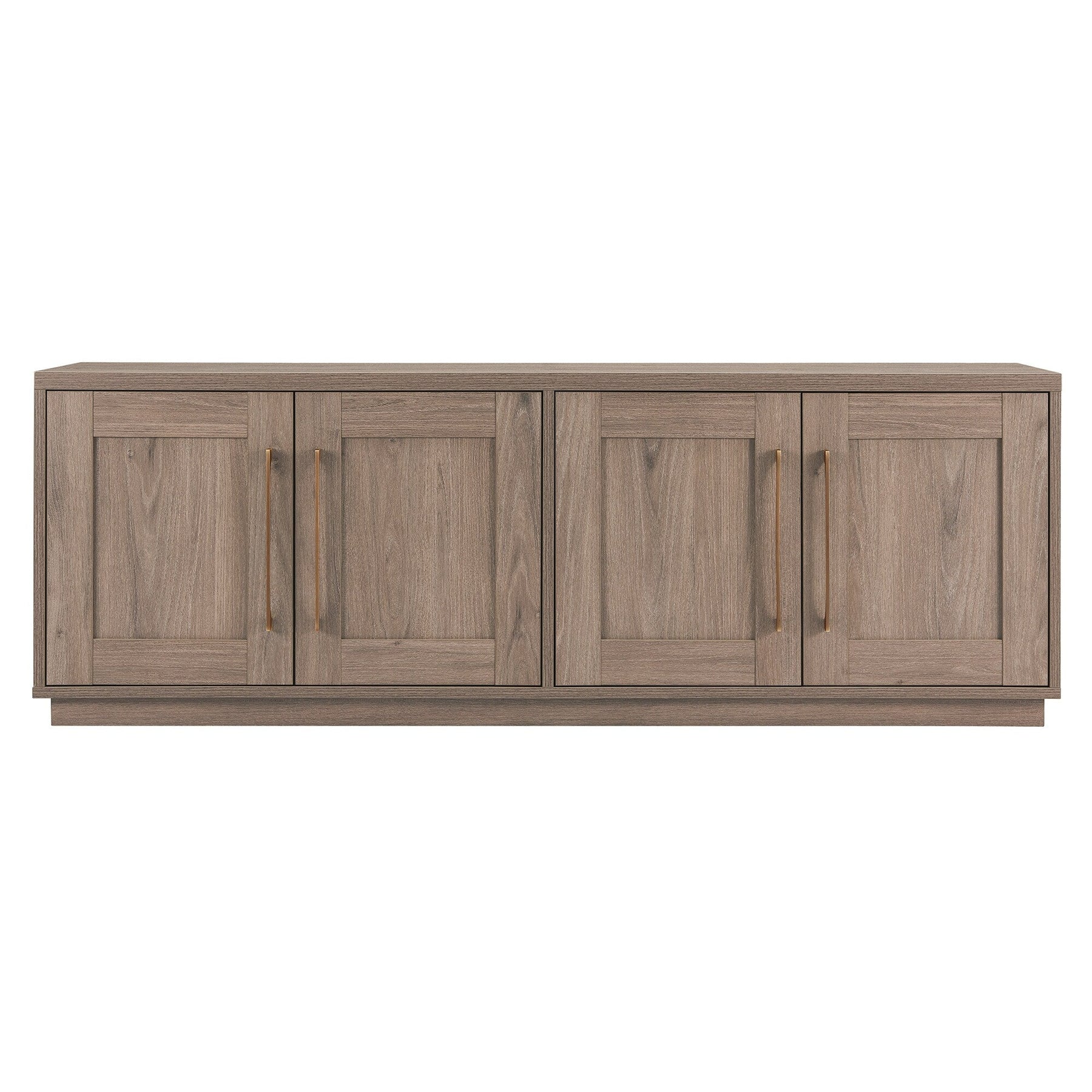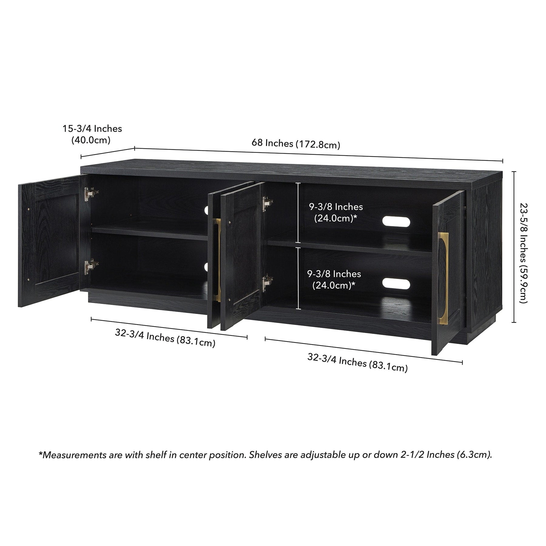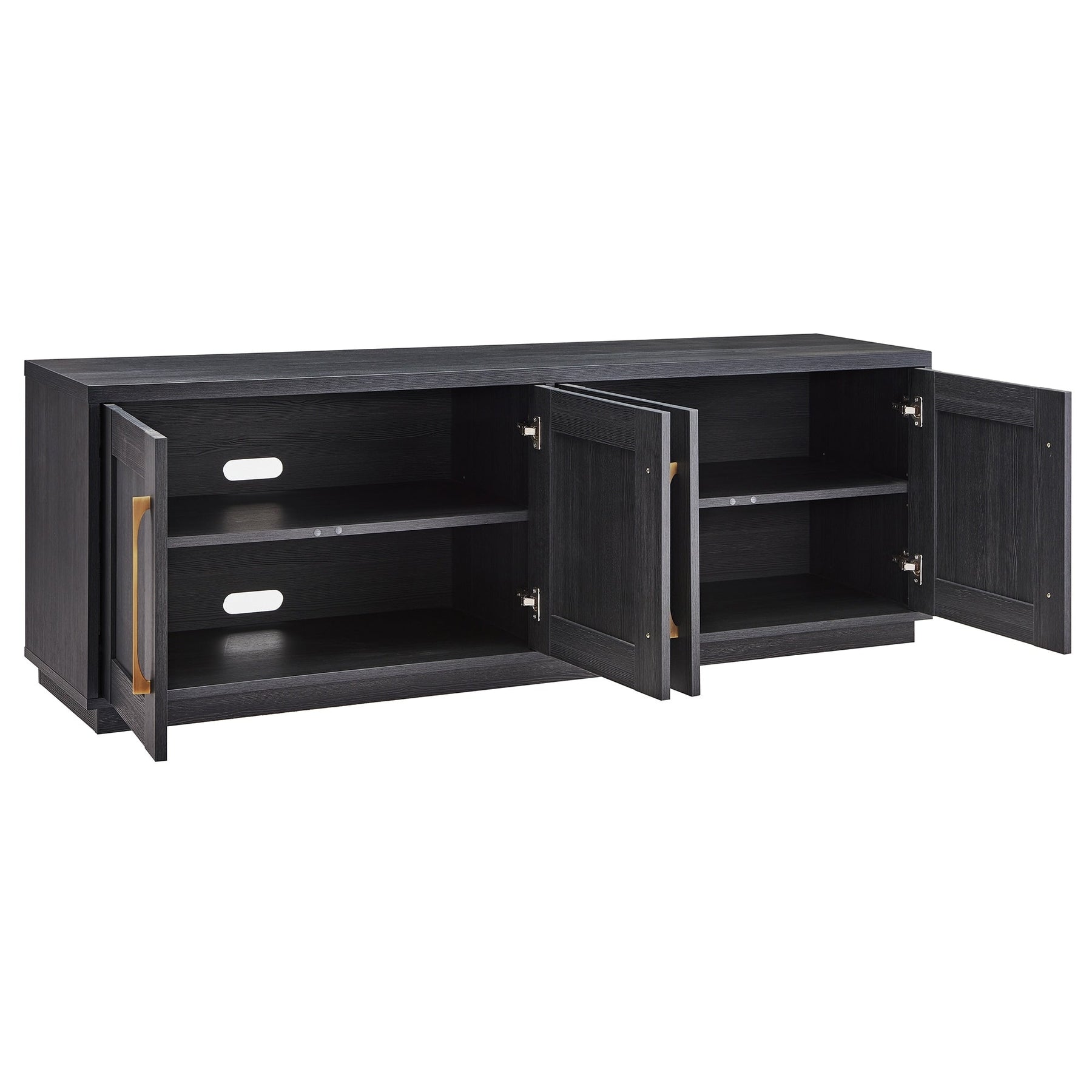 Combine functionality and classic transitional design with this modern TV stand. Its rich wood tone creates a warm neutral palette that will blend seamlessly into any color scheme, while its classic styling pairs perfectly with the existing design inspiration of your living room, den, or game room. This solid-backed stand features two large enclosed cabinets with sleek brass-finished hardware. Cable management cut-outs and adjustable inner shelves help keep your media storage and consoles organized.