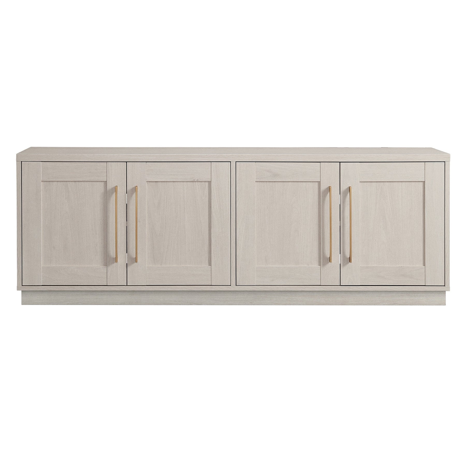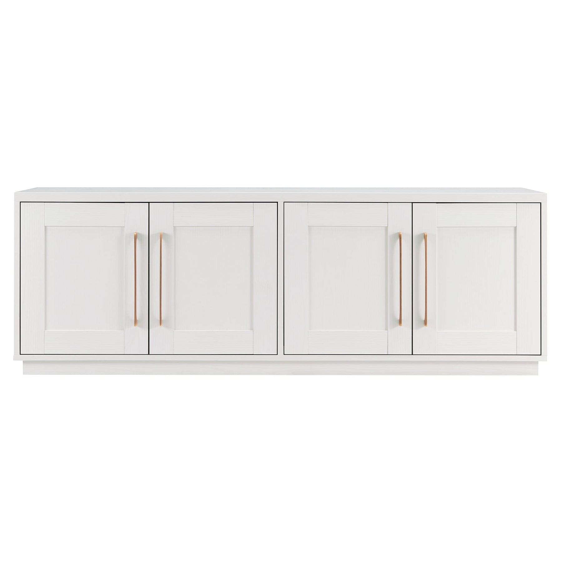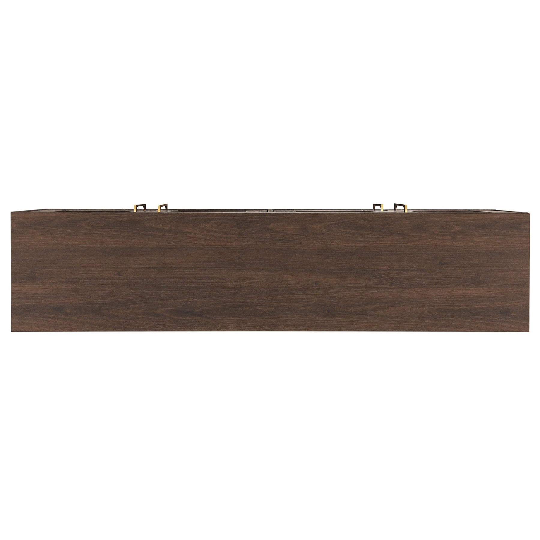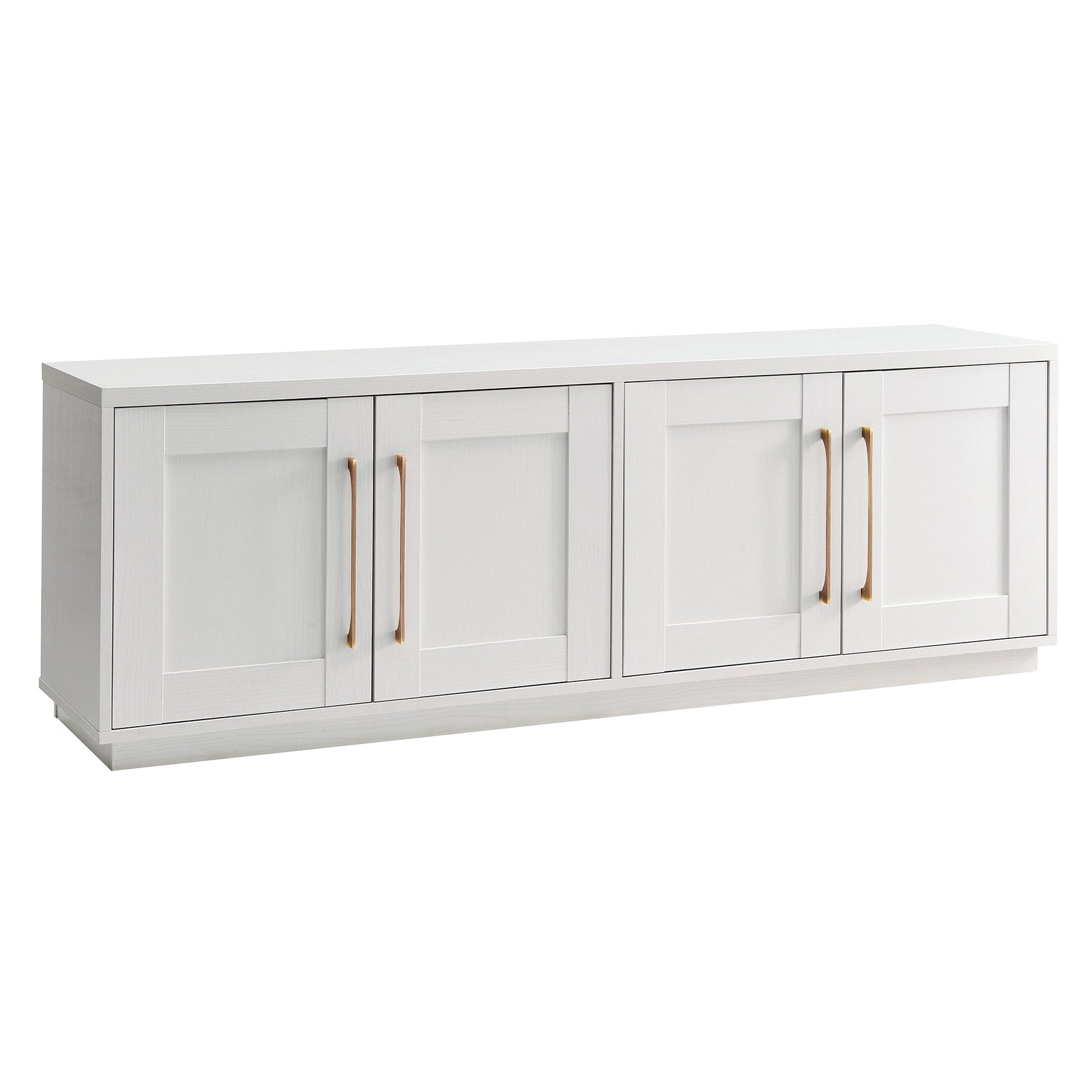 Combine functionality and classic transitional design with this modern TV stand. Its rich wood tone creates a warm neutral palette that will blend seamlessly into any color scheme, while its classic styling pairs perfectly with the existing design inspiration of your living room, den, or game room. This solid-backed stand features two large enclosed cabinets with sleek brass-finished hardware. Cable management cut-outs and adjustable inner shelves help keep your media storage and consoles organized.