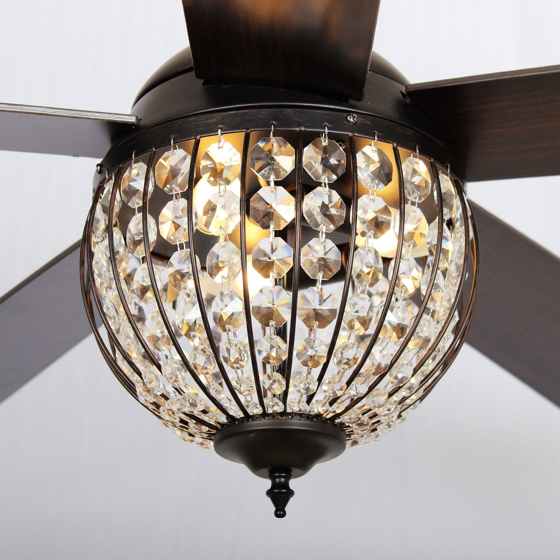 Simple and stylish, this modern industrial ceiling fan comes in an antique bronze finish with five wooden blades. The light kit comes in an elegant-style open crystal globe design for a coordinating look with three E12 max 25-watt bulbs (not included). This great-looking fan includes a remote control with light and speed functions for easy operation. A smart addition to living rooms, bedrooms, and more. Manual reverse keeps you comfortable year-round. In warm weather, run the fan counterclockwise to stay cool. In cold weather save money by reversing the ceiling fan direction to push warm air down.