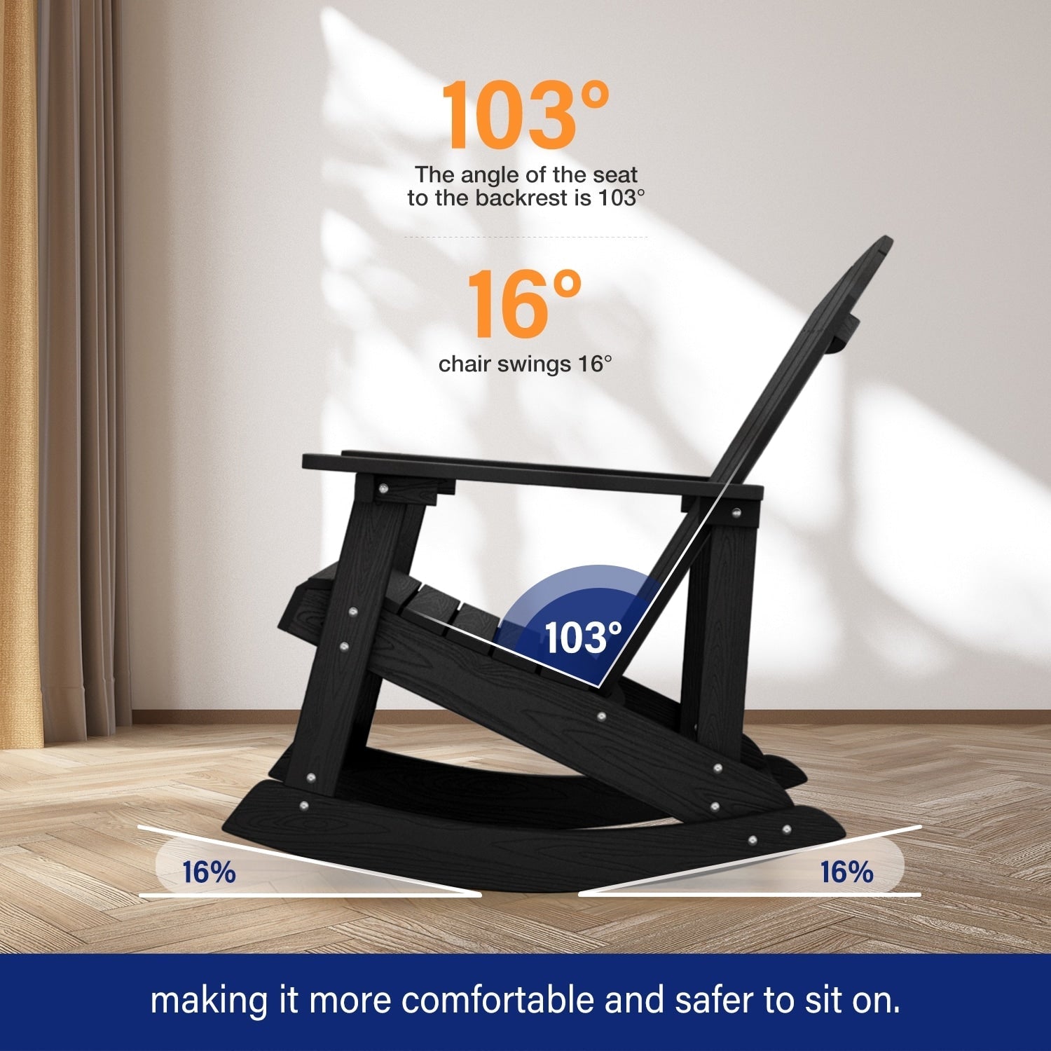 Bring style and durability to your indoor/outdoor space with the WINSOON All Weather HIPS Outdoor Rocking Chair. This chair is made of HIPS, a sturdy and water/UV/weather-resistant material that won't fade, crack, warp, peel, or rot. The wood grain appearance adds a classic touch without the maintenance of real wood. This chair is equipped with a high backrest and wide armrests, providing maximum comfort and stability. It has passed 120000 tests and is suitable for year-round use. Assembling the chair is easy and comes with all stainless tools included. It also comes with a 3-year warranty.