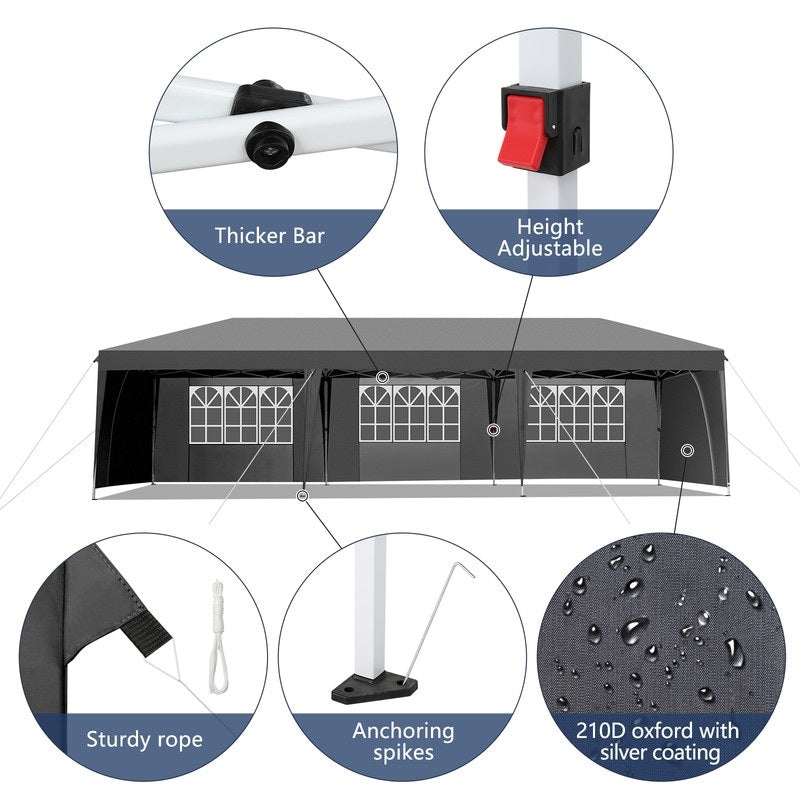 Your family will have a wonderful time with this large outdoor canopy. With a durable, hard canopy and thick, sturdy posts, this canopy is truly the ultimate in practicality and convenience. It comes with a carrying bag with rollers so that you can easily bring the convenient gazebo anywhere as a quick, sun-coverage solution. The canopy top also wear silver coating, which is UV-resistant and waterproof. The durable powder-coated steel frame features pre-drilled holes so you can anchor it if desired. Set it up on your lawn or on your patio, or take it during camping, and get ready to enjoy delightful outdoor life!