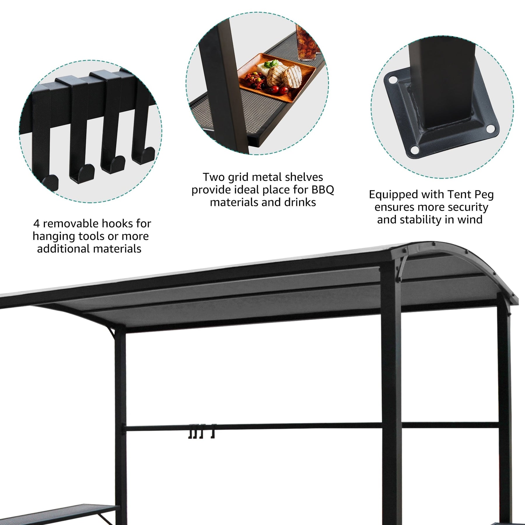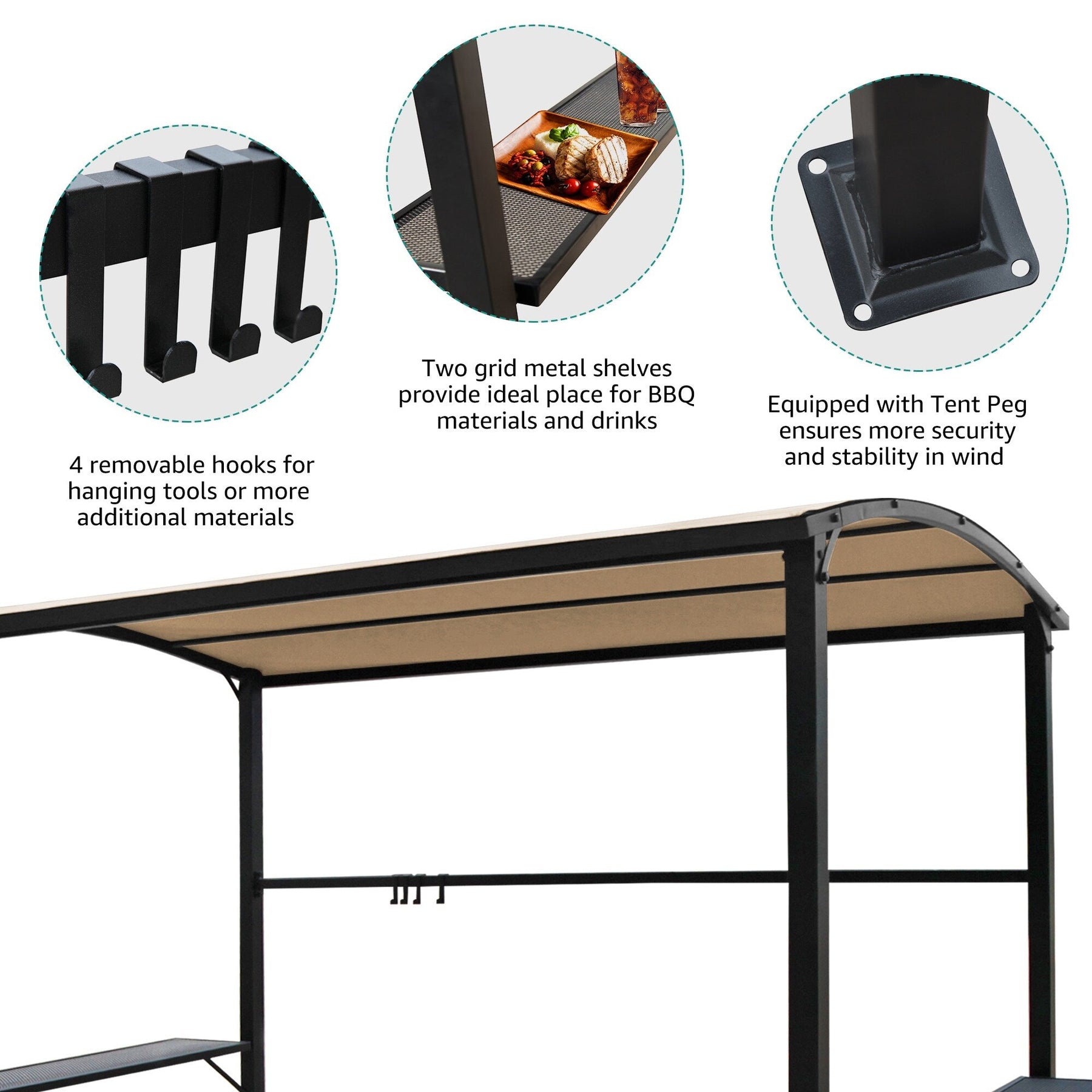 Grill in style and comfort with our Steel Frame Grill Gazebo Canopy Barbecue Shelter! Made of rust-resistant steel and durable polyester, this gazebo is designed to protect you from the elements with its UV and water-resistant covering. With two mesh shelves and 4 hanging hooks, you can easily store your food and drinks within reach. Plus, the 16 ground nails secure it against strong winds. Assembly is a breeze with all tools and instructions included.