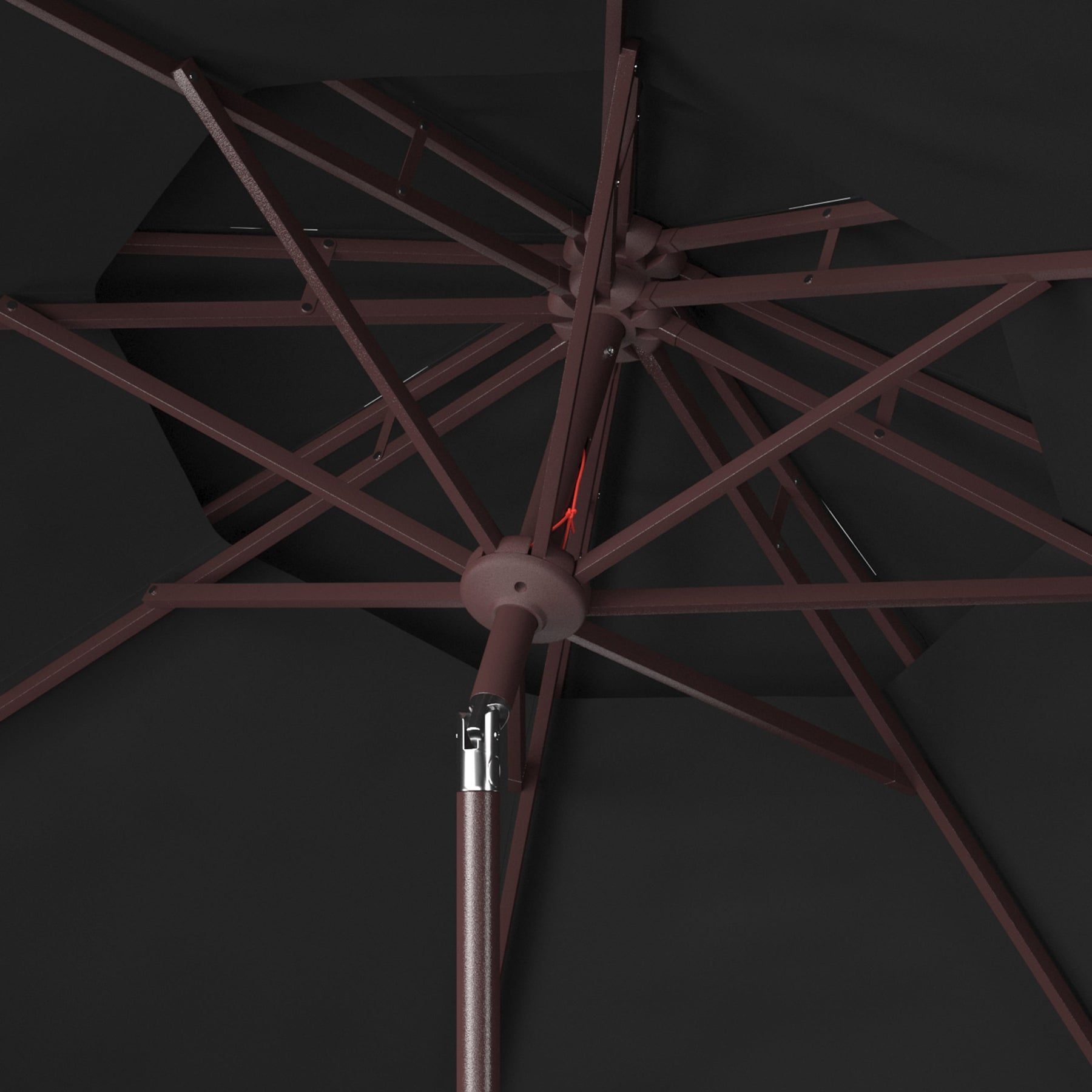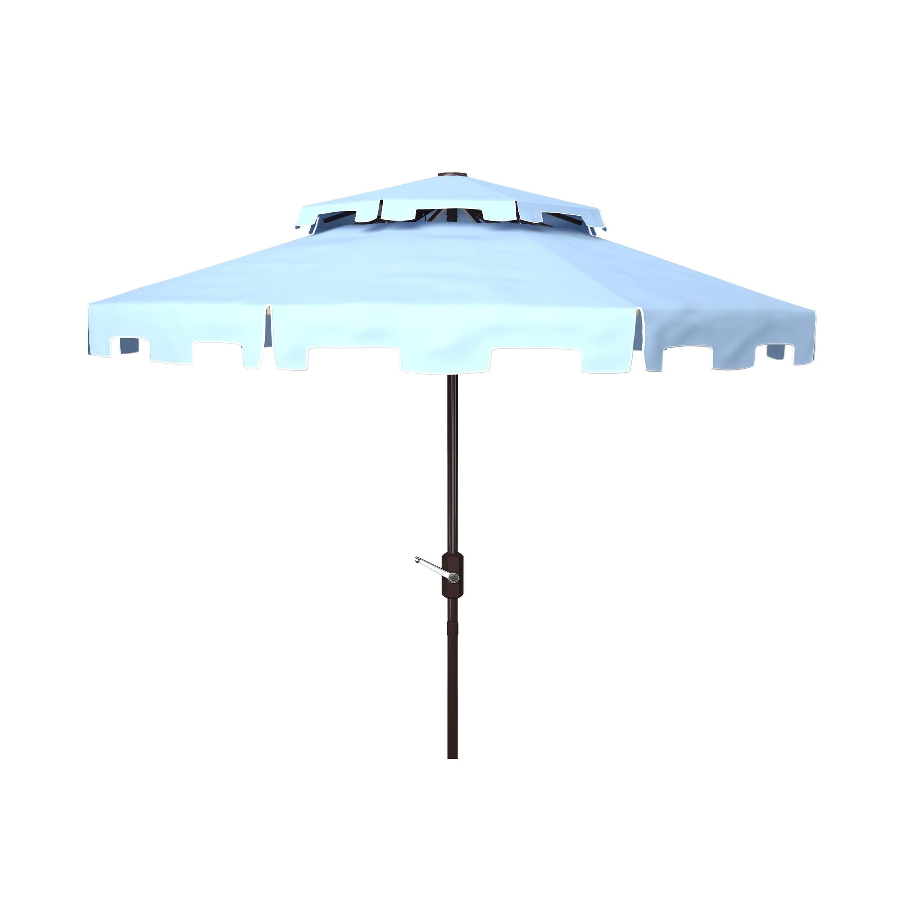 A classic market umbrella gets a stylish makeover in coastal cool and white with a double top for chic European flair. Its nine foot polyester canopy and brown aluminum post make it ideal for the veranda or pool deck. Includes easy crank and tilt mechanism.