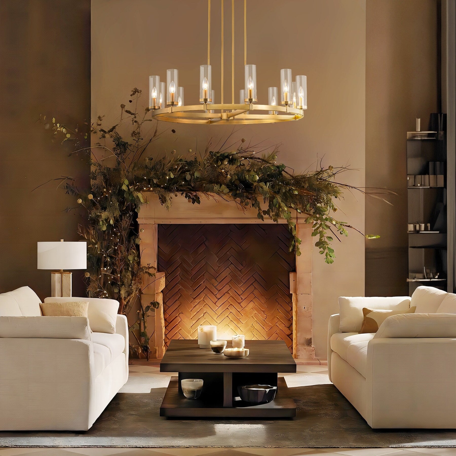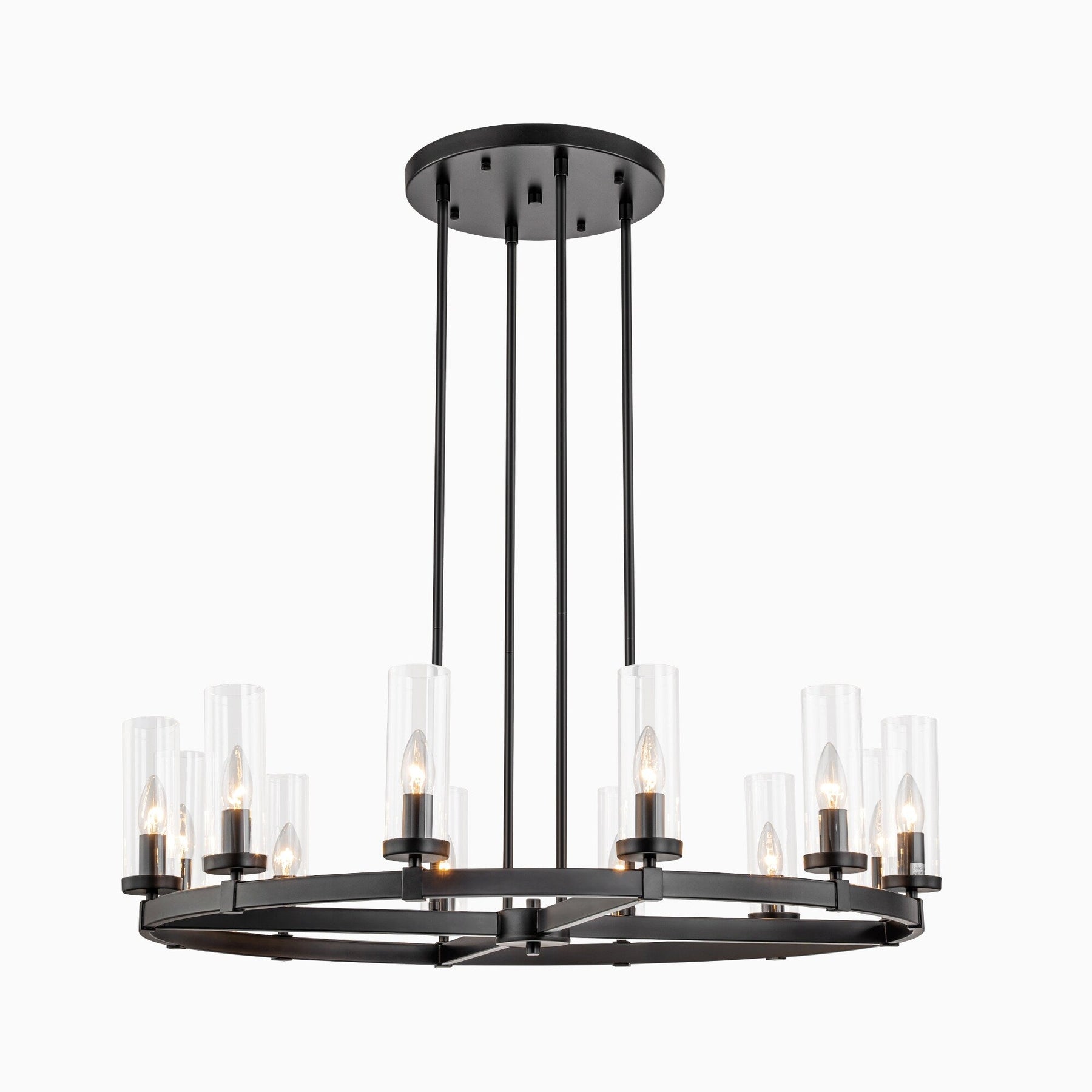This 12-light retro industrial circle wagon wheel chandelier clear glass island light with a 35.4-inch diameter stands as a testament to unparalleled craftsmanship and design ingenuity. The lighting goes through the pure-clear glass shade and imparts a soft and ample illumination, casting a luminous aura that gracefully envelops your living space. Meanwhile, this opulent fixture showcases a distinctive wheel-shaped frame and elegantly cylinder candlestick-style bulbs (not included) design, exuding a commanding presence with a pronounced vintage industrial aesthetic.