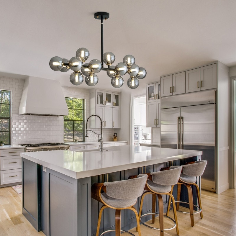 Add a touch of sophistication to your space with this 16-light sputnik chandelier. There are available in brass, amber, smoke grey and smoke grey with milky. The brass chandelier features linear metal rods and white globe frosted glass shades, all finished in satin brass for a timeless look. The amber chandelier has a stylish linear metal frame with transparent amber-colored glass globe shades, enhancing your space. The smoked grey chandelier uses a linear metal frame with smoke-colored glass globe shades, creating a fashionable appearance. Their designs are simple yet exquisite, and the spherical shades ensure even and soft lighting, making this sputnik chandelier an excellent choice for both functional and decorative lighting. Perfect for any style of room, from modern to retro to industrial. Ideal for your living room, dining room, bedroom, or kitchen.