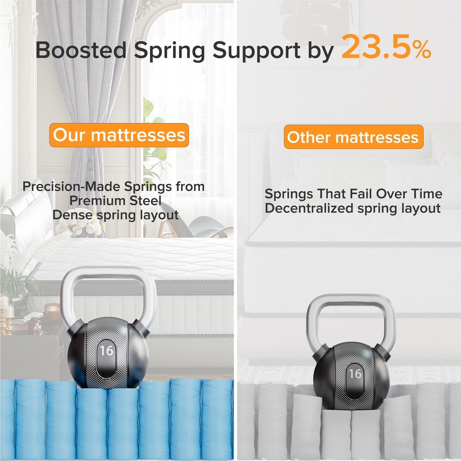 • Coil springs 23.5% thicker than market standard: Provides better support, longer lifespan, and prevents collapsing.