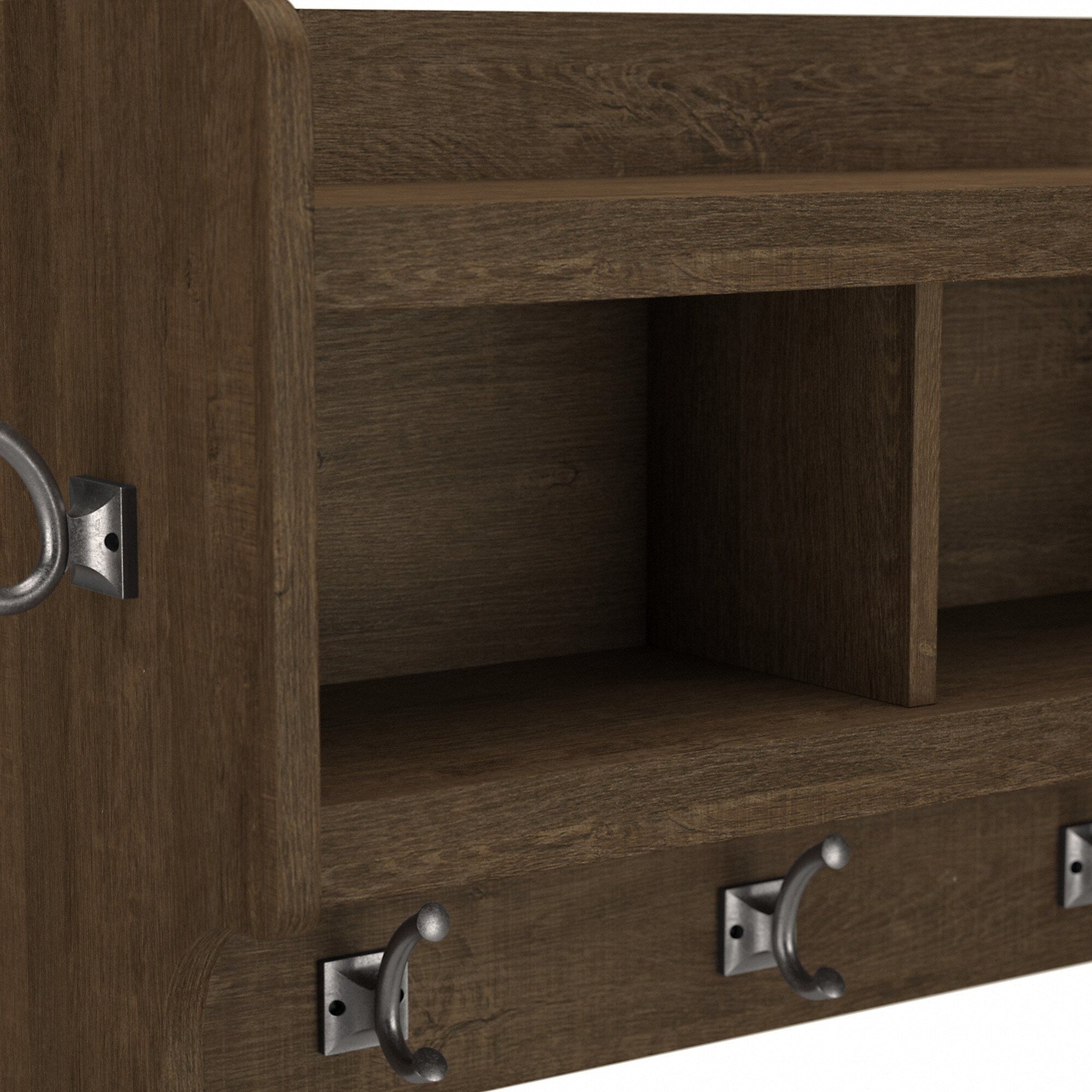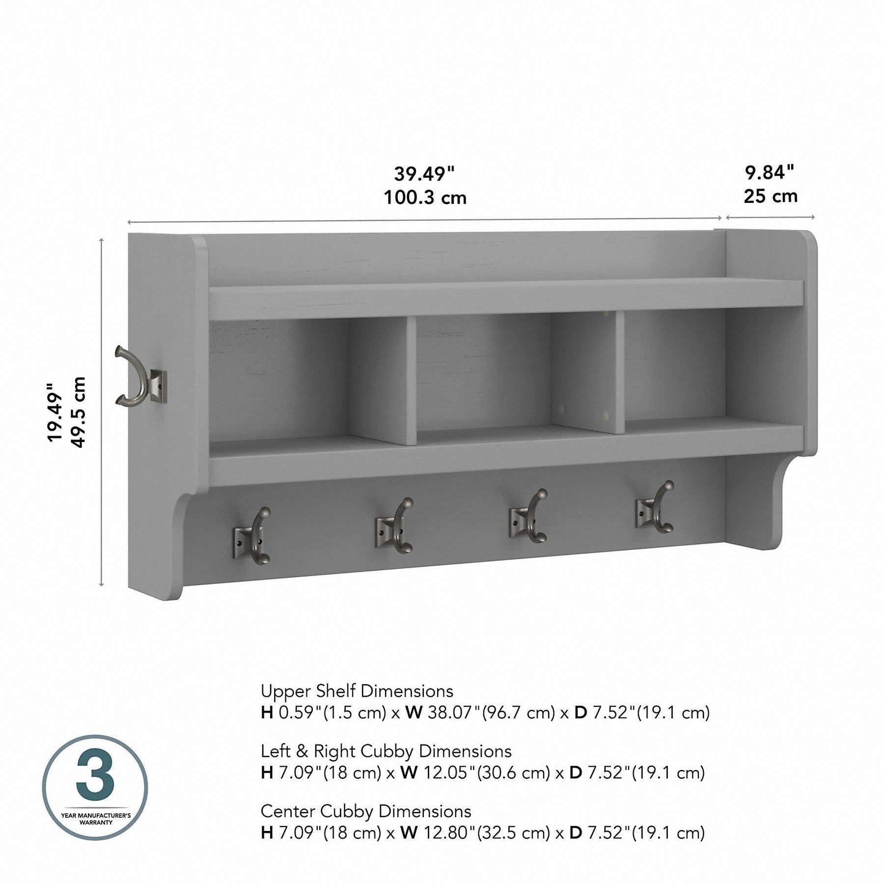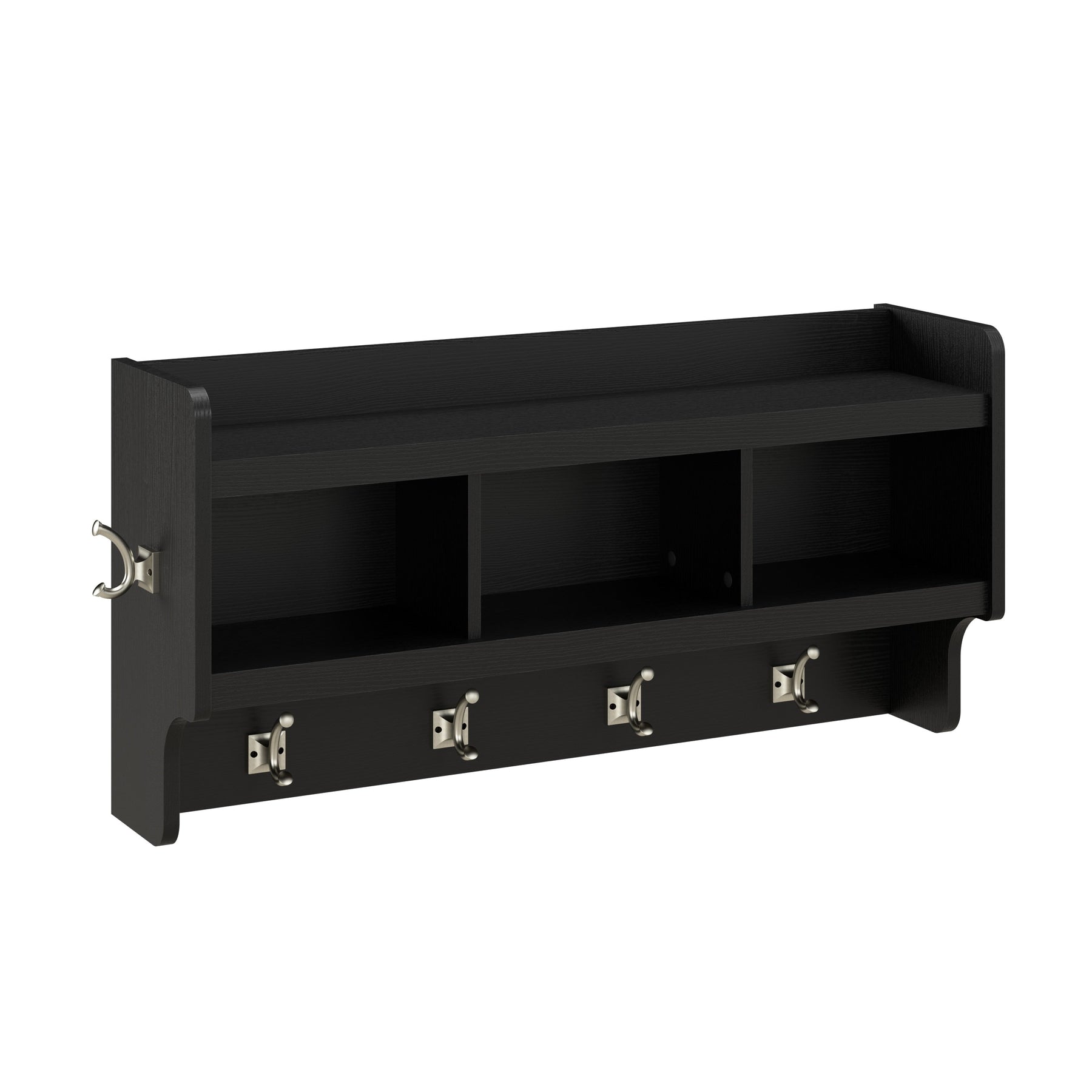 The Bush Furniture Woodland 40W Wall Mounted Coat Rack with Shelf combines transitional styling and a practical design to offer an ideal entryway organizer. Store outerwear and other daily essentials in one convenient location so that everything is right where you need it when it's time to head out the door again. The wall shelf includes four Weathered Nickel coat hooks in the front and one on each side for hanging jackets, hats, scarves and more. Smaller items like gloves and keys can be stashed neatly inside three open cubby spaces while the top shelf provides an area to brighten up your entryway with decorations. Coat hooks support up to 15 pounds, and the total weight capacity of the wall mounted shelf is 25 pounds. The wall coat rack's transitional design blends elements of contemporary and traditional styling to complement a wide range of home furnishings while your choice of several attractive finish options make it easy to find the perfect look for your space. This entryway wall organizer has been rigorously tested to meet Bush Furniture's standards for safety, performance and durability and is backed by a 3 Year Manufacturer's Warranty. See the full Woodland Collection to complete your home's entryway, mudroom or foyer with style.